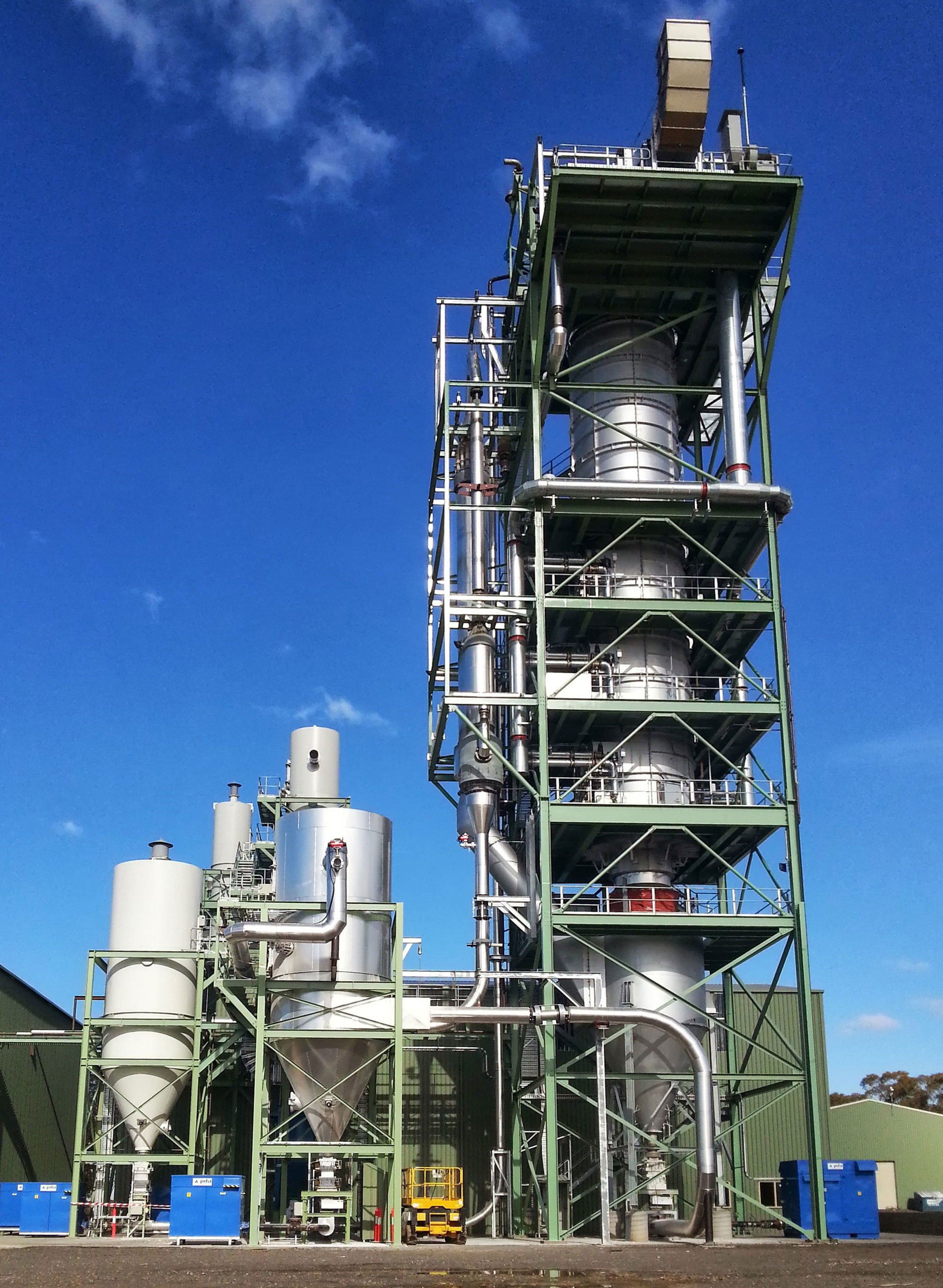 Eine große, industrielle Anlage mit einem hohen, mehrstufigen Teilen im Zentrum. Mehrere kleinere Tanks und Rohre sind mit der Säule verbunden.