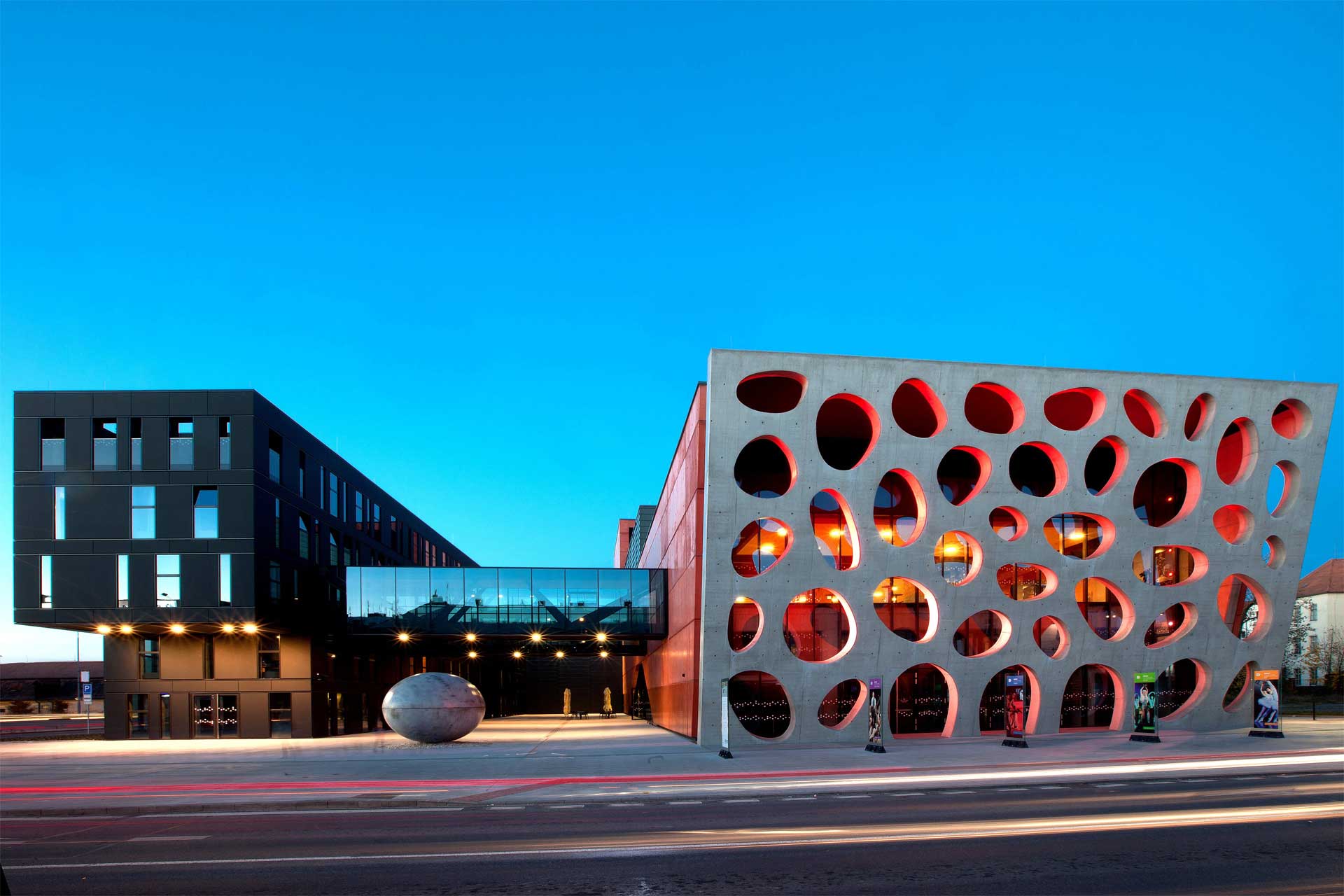 Es ist das erste Gebäude in der Tschechischen Republik mit einer Fassade aus 600 m³ Farbbeton. Ein weiteres einzigartiges Betonelement des Theatergebäudes ist die „Blasen“-Fassade auf der Südseite, die einen Bühnenvorhang darstellen soll. Die Wand ist leicht nach vorn geneigt, als wolle sie die Zuschauer in das Theater einladen. Der Architekt gab vor, dass keine Nähte oder Fugen in der Blasen-Fassade zu sehen sein dürfen, weshalb sie aus einem Guss hergestellt werden musste. Während des Baus der Rahmenkonstruktion erforderten die Formung und Positionierung der 40 unregelmäßigen ovalen Löcher – drei davon im Bodenbereich als Eingang zum Theater – ein hohes Maß an Präzision.