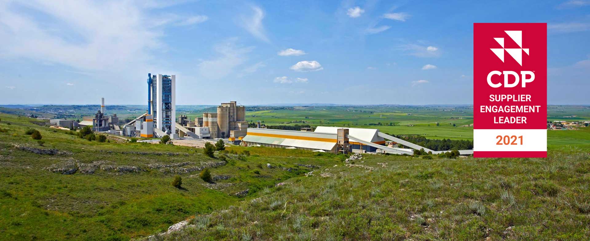 A cement plant nestled in a rural landscape. The plant consists of several large industrial buildings and structures surrounded by green fields and hills. A clear blue sky with white clouds is visible above. In the foreground, there is a red banner with the CDP logo and the text "SUPPLIER ENGAGEMENT LEADER 2021."